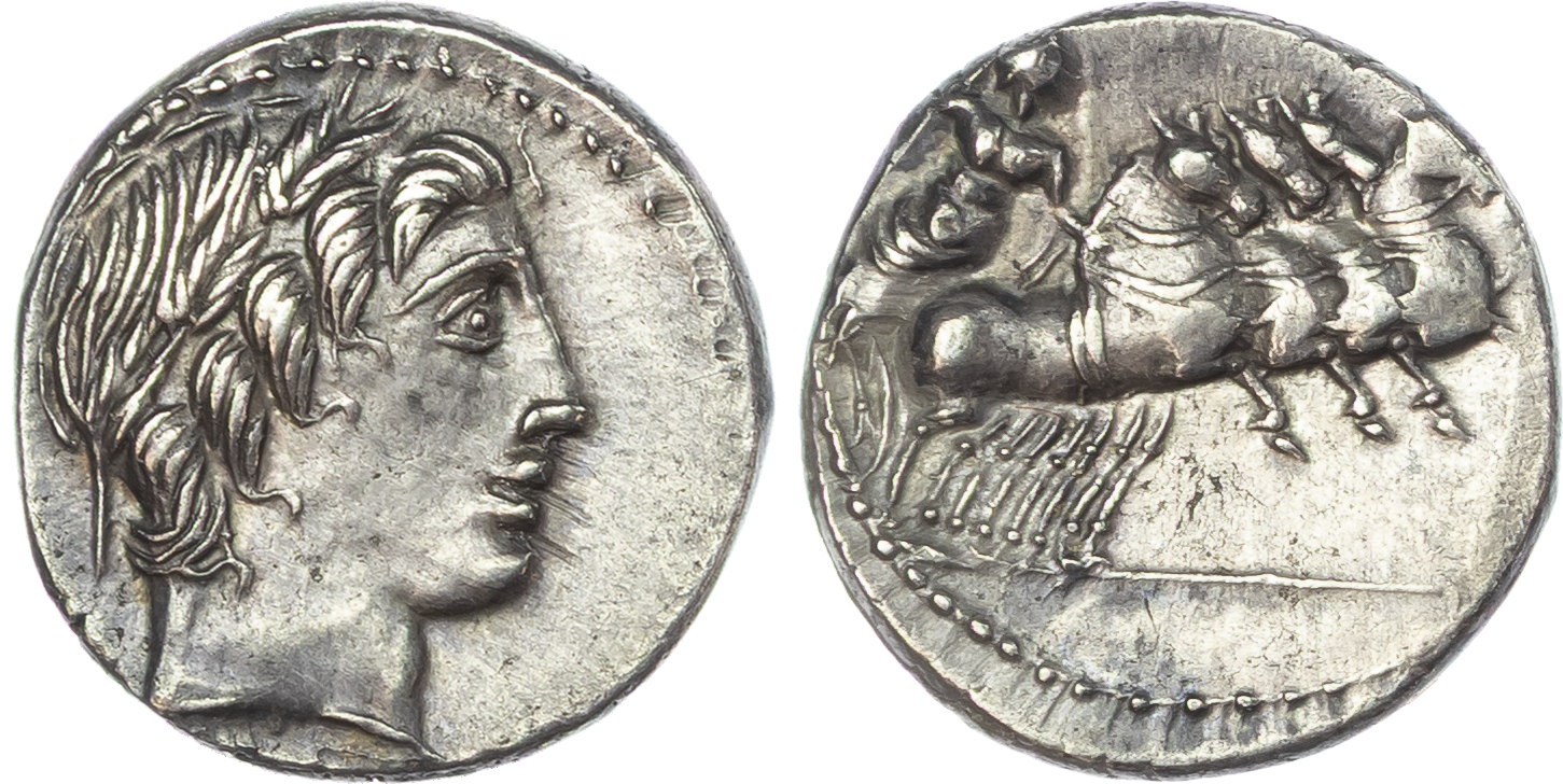 Anonymous (86 BC) Silver Denarius, Rome, 4.05g. Laureate head of Apollo right. Rev. Jupiter, holding thunderbolt and reins, driving quadriga right. (Crawford 350a/2; Sydenham 723). Extremely Fine.