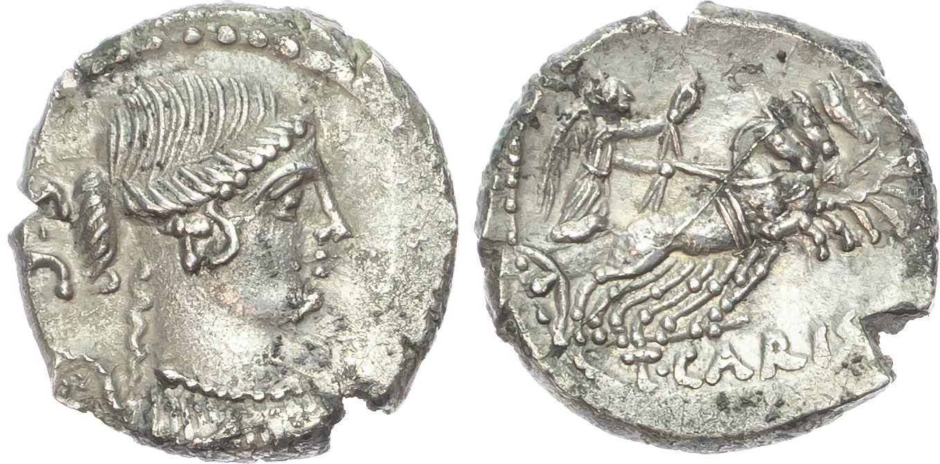Roman Republic, T. Carisius (46 BC), Silver Denarius, Rome, 3.52g. Obverse: Winged bust of Victory right. Reverse: Victory driving quadriga right. (446/5). Good Very Fine. Small flan and striking splits.
