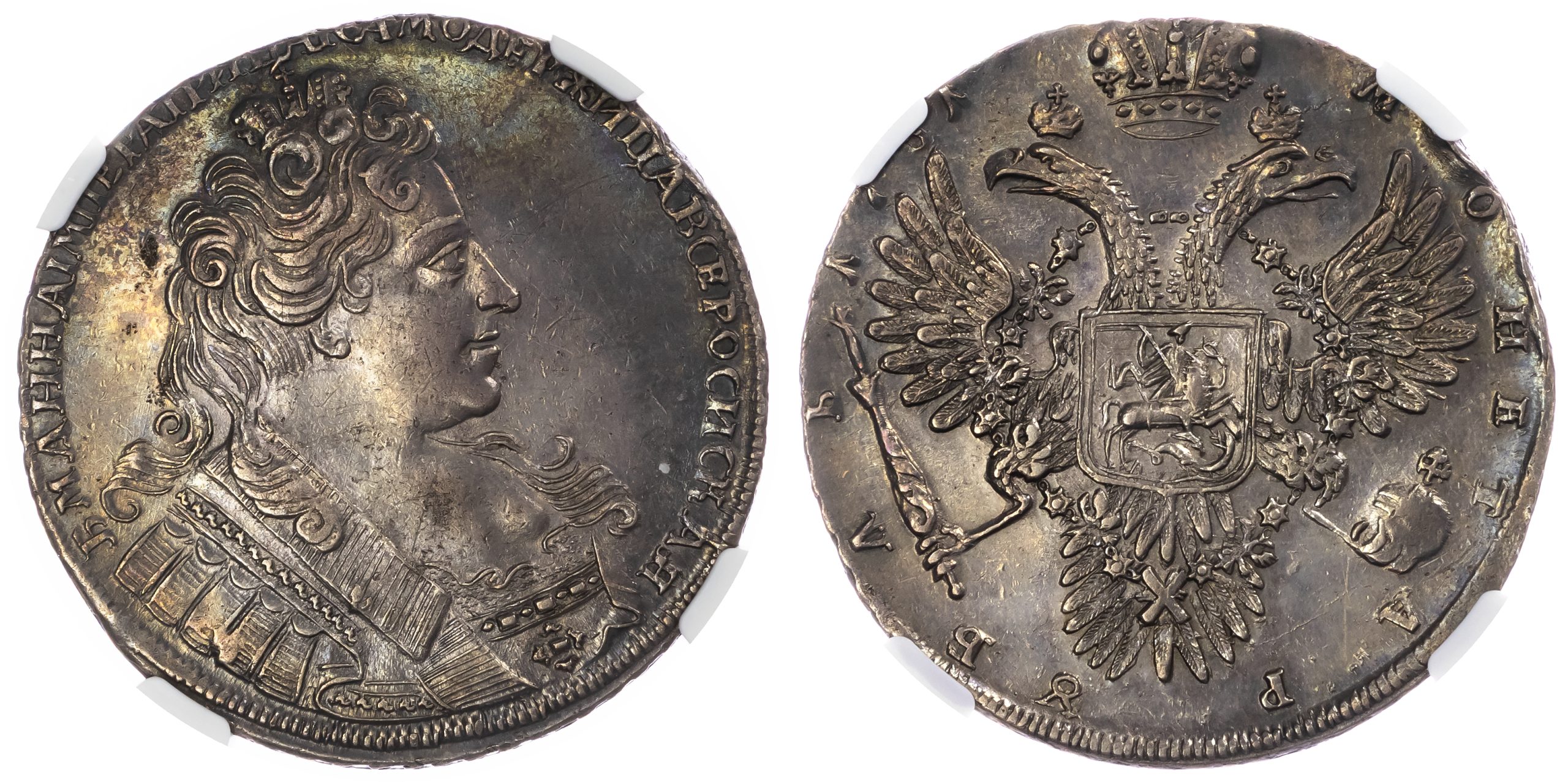Russia, Anna Ivanovna (1730-1740), silver Rouble, 1731, Kadashevsky mint, Moscow (Bit. 39; Diakov 10). In NGC holder graded AU Details – Cleaned (8222220-001). Despite being historically cleaned, the coin has retoned beautifully over time.