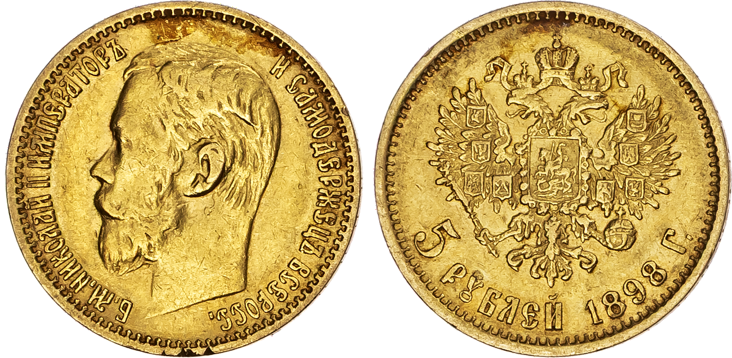 Russia, Nicholas II (1894-1917), gold 5 Roubles, 1898, intials АГ, St Petersburg, 4.28g (Bit. 26). Very Fine, edge knocks to 6 o’clock.