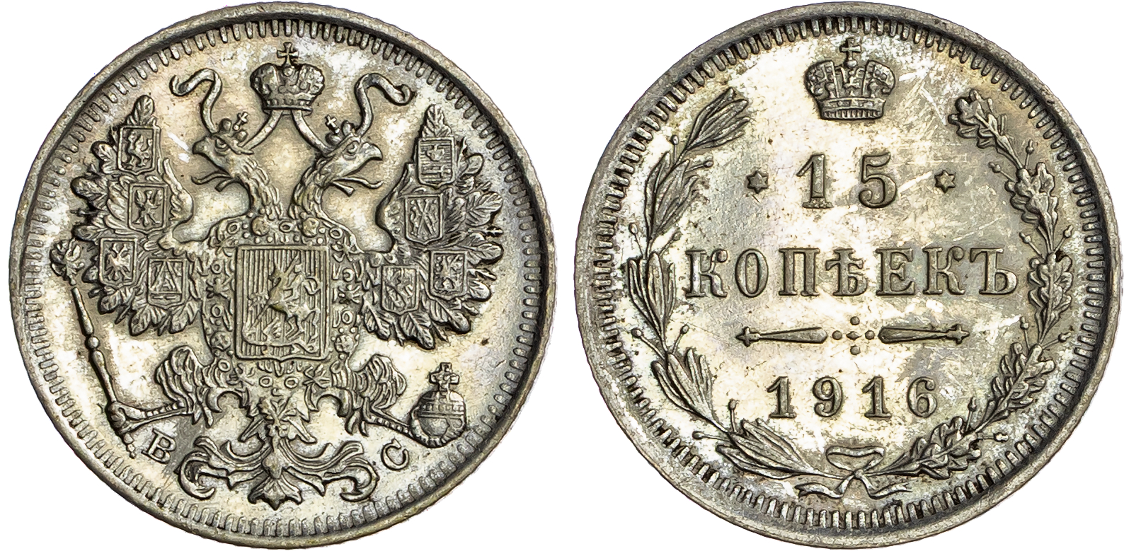 Russia, Nicholas II (1894-1917), silver 15 Kopeks, 1916, St. Petersburg, 2.63g (Bit. 143). Good Very Fine, harshly cleaned.