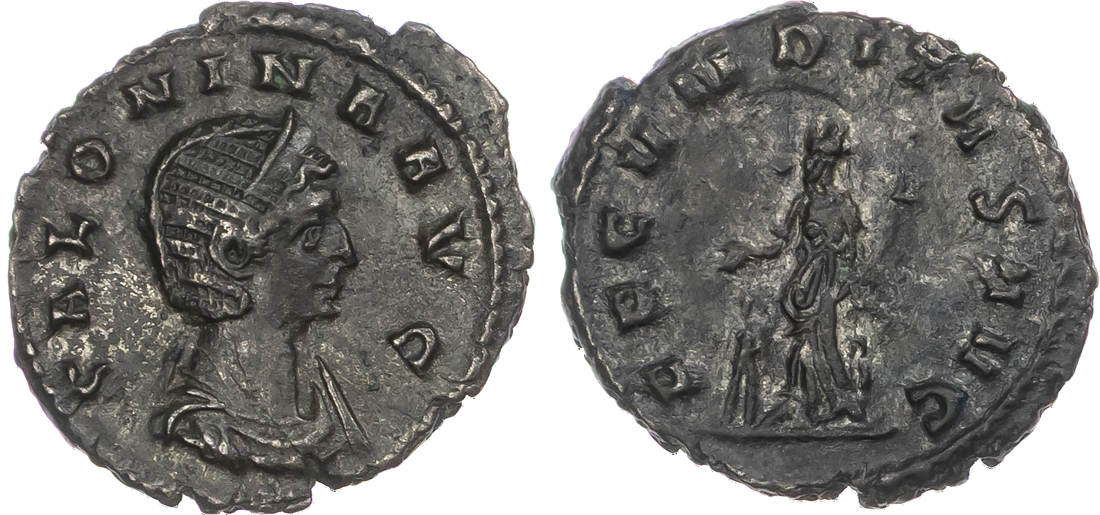 Salonina (wife of Gallienus) AE Denarius, Rome, AD 265-267, 2.59g. SALONINA AVG, draped bust of Salonina right. Rev. FECVNDITAS AVG, Fecunditas standing left, holding cornucopia, child to left. (RIC 35). Nearly Extremely Fine. Rare.