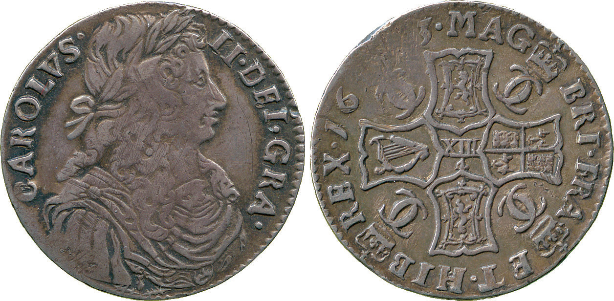 Charles II, Silver Merk, 1673, First Coinage, Type II, laureate and draped bust right in armour, thistle with leaves below bust, rev die axis at 9 o’clock, cruciform shields, crowned interlinked Cs in angles, value at centre, date in legend (SCBI 35:1590-3; S.5611).
