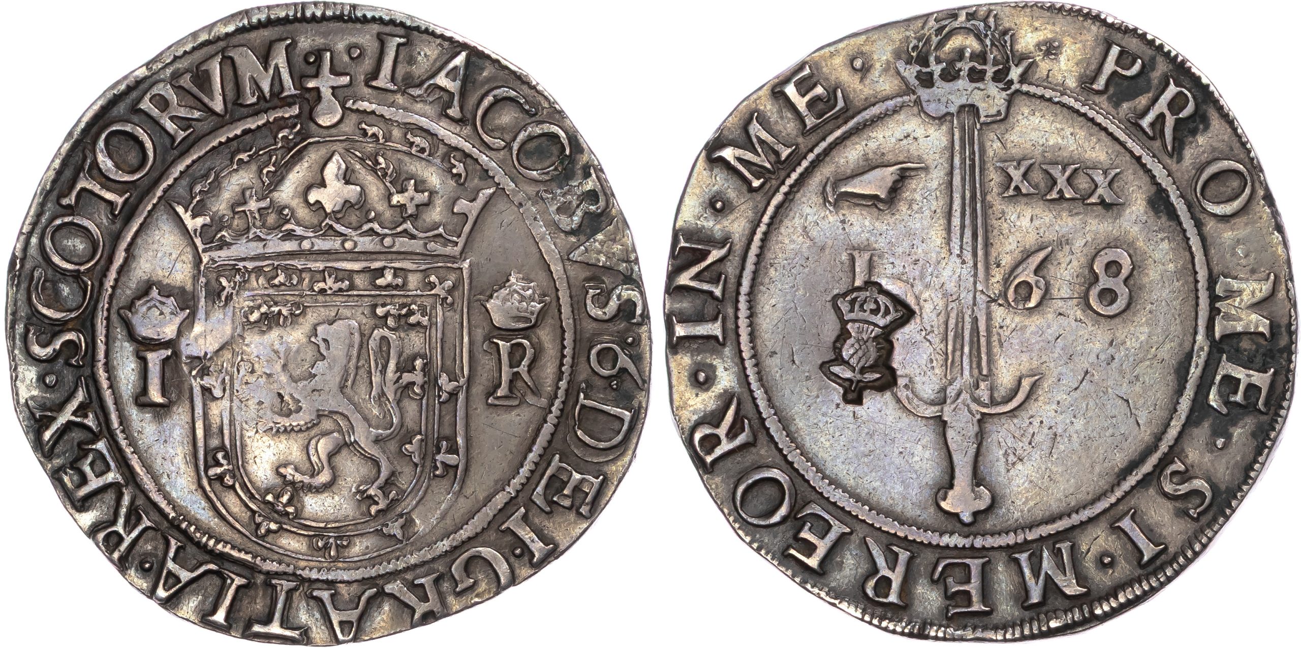 Scotland, James VI (1567‑1625), Silver Ryal (Sword Dollar), First Coinage, 1568. Revalued with a Thistle counterstamp during the Revaluation of 1578. IACOBVS 6 DEI GRATIA REX SCOTORVM, crowned shield of Scotland, crowned I R to either side, Rev. PRO ME SI MEREOR IN ME, crowned sword centre, date at either side, pointing hand to left side, XXX to right. Thistle countermark in lower left, 30.48g/5h. (S. 5472). Good Very Fine, double struck. Some deposits around legend.
