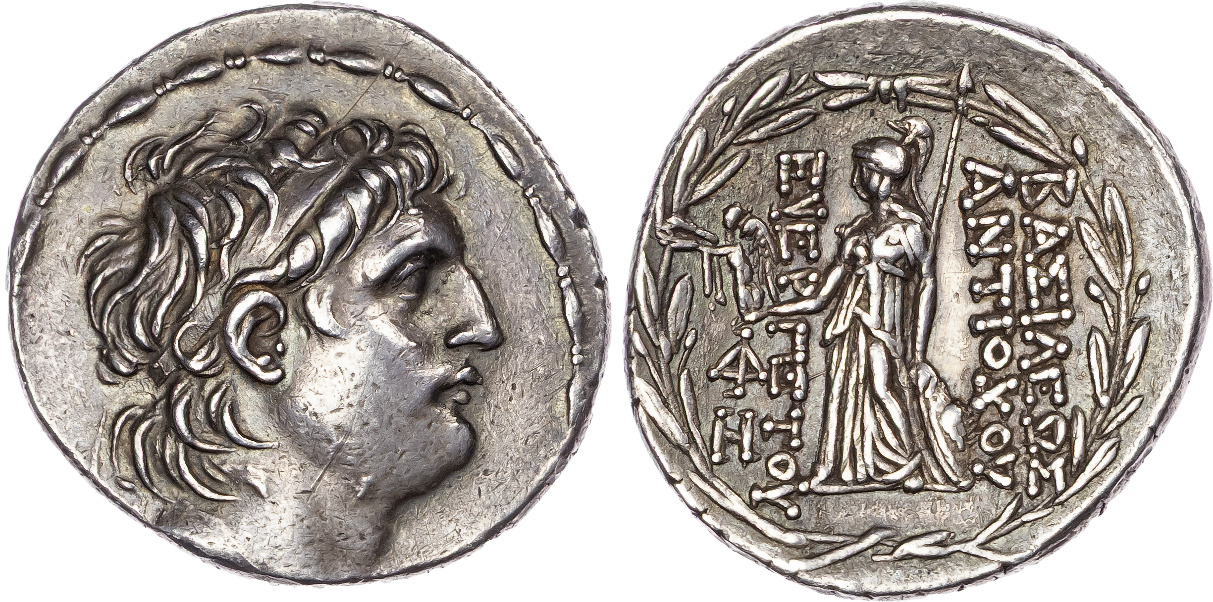 Seleucid Empire, Antiochos VII Euergetes (138-129 BC) AR Tetradrachm, Antioch on the Orontes, 16.98g. Diademed head of Antiochos right. Rev. ΒΑΣΙΛΕΩΣ / ΑΝΤΙΟΧΟY – EYEPΓETOY, Athena standing left, holding spear, shield, and Nike, all within a laurel wreath. (HGC 9, 1067d; SC 2061). Good Very Fine.