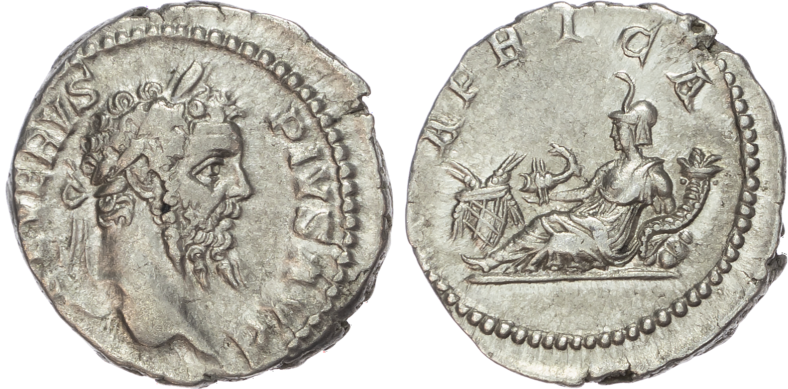 Septimius Severus (AD 193-211) Silver Denarius, Rome, AD 202-210, 3.53g. Obverse: SEVERVS PIVS AVG, laureate head of Septimius Severus right. Reverse: AFRICA, Africa reclining left, wearing elephant headdress, holding scorpion and cornucopiae, modius behind. (RIC 254; BMC 311). Good Very Fine.