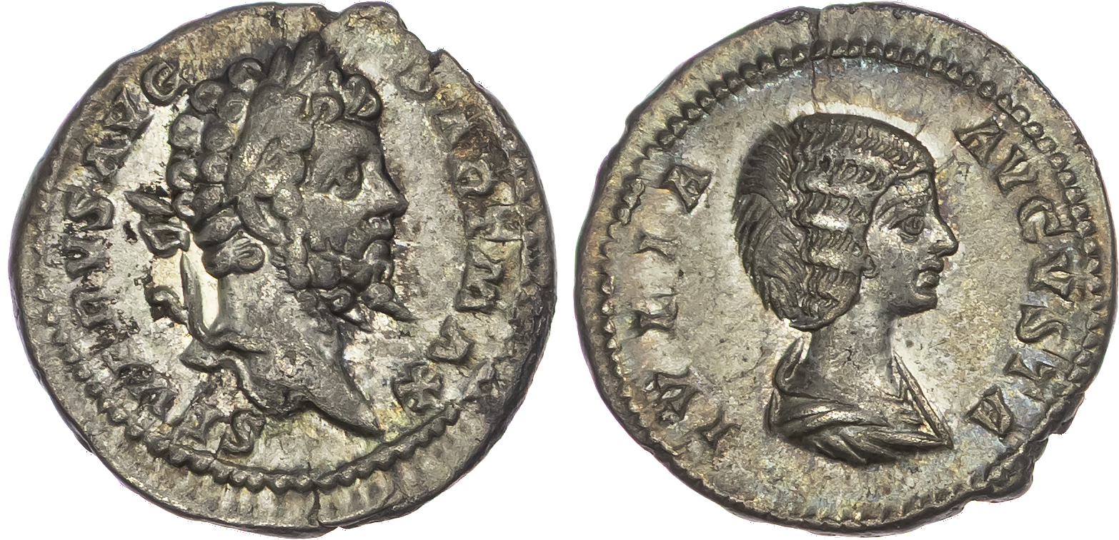 Septimius Severus (AD 193-211), with Julia Domna, AR Denarius, Rome, AD 200-201, 3.09g. SEVERVS AVG PART MAX, laureate head of Severus right. Rev. IVLIA AVGVSTA, draped bust of Julia Domna right. (RIC 161a; RSC 2). Good Very Fine. Rare.