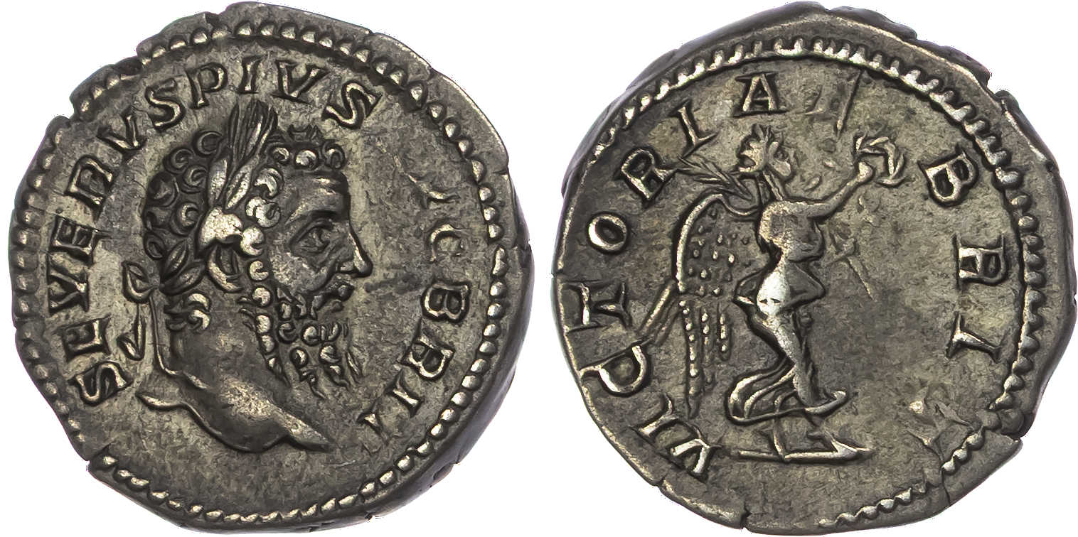 Septimius Severus (AD 193-211) AR Denarius, Rome, AD 210-211, 3.13g. SEVERVS PIVS AVG BRIT, laureate head of Severus right. Rev. VICTORIAE BRIT, Victory advancing right, holding wreath and palm. (RIC 332; RSC 727). Good Very Fine.