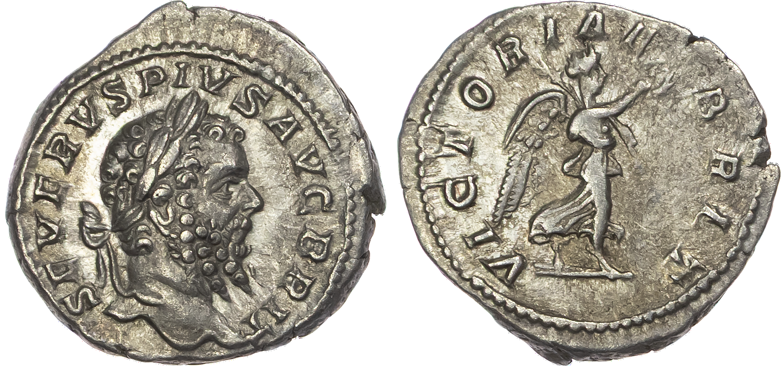 Septimius Severus (AD 193-211) AR Denarius, Rome, AD 210-211, 3.31g. SEVERVS PIVS AVG BRIT, laureate head of Severus right. Rev. VICTORIAE BRIT, Victory advancing right, holding wreath and palm. (RIC 332; RSC 727). Good Very Fine or better.