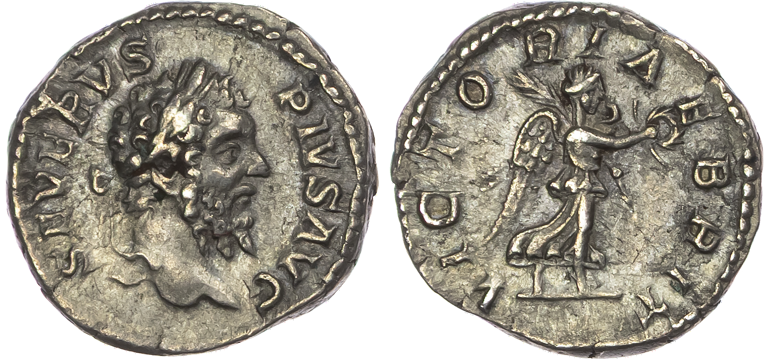 Septimius Severus (AD 193-211) AR Denarius, Rome, AD 210-211, 3.33g. SEVERVS PIVS AVG BRIT, laureate head of Severus right. Rev. VICTORIAE BRIT, Victory advancing right, holding wreath and palm. (RIC 332; RSC 727). Good Very Fine.