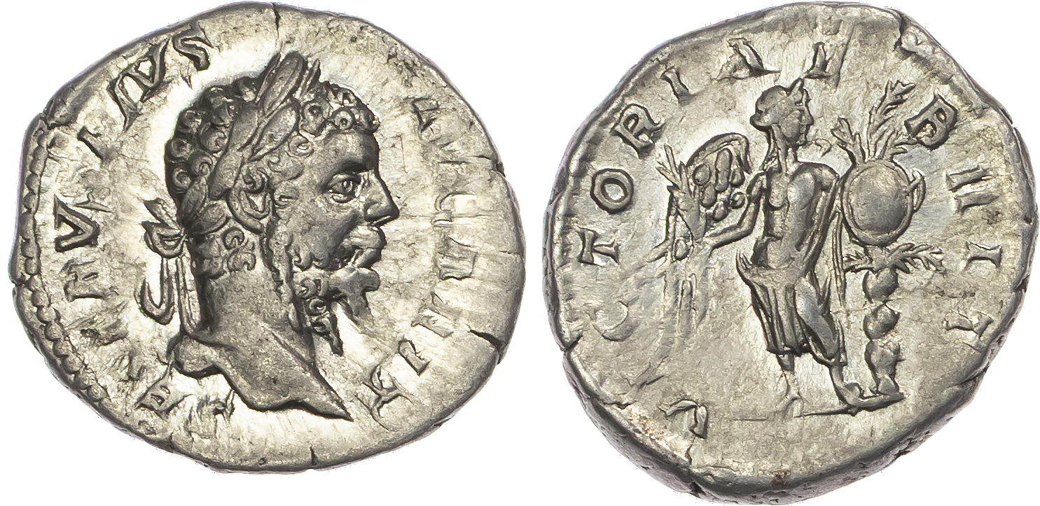 Septimius Severus (AD 193-211) AR Denarius, Rome, AD 210-211, 3.67g. SEVERVS PIVS AVG BRIT, laureate head of Severus right. Rev. VICTORIAE BRIT, Victory standing facing, head left, placing shield on… Read more
