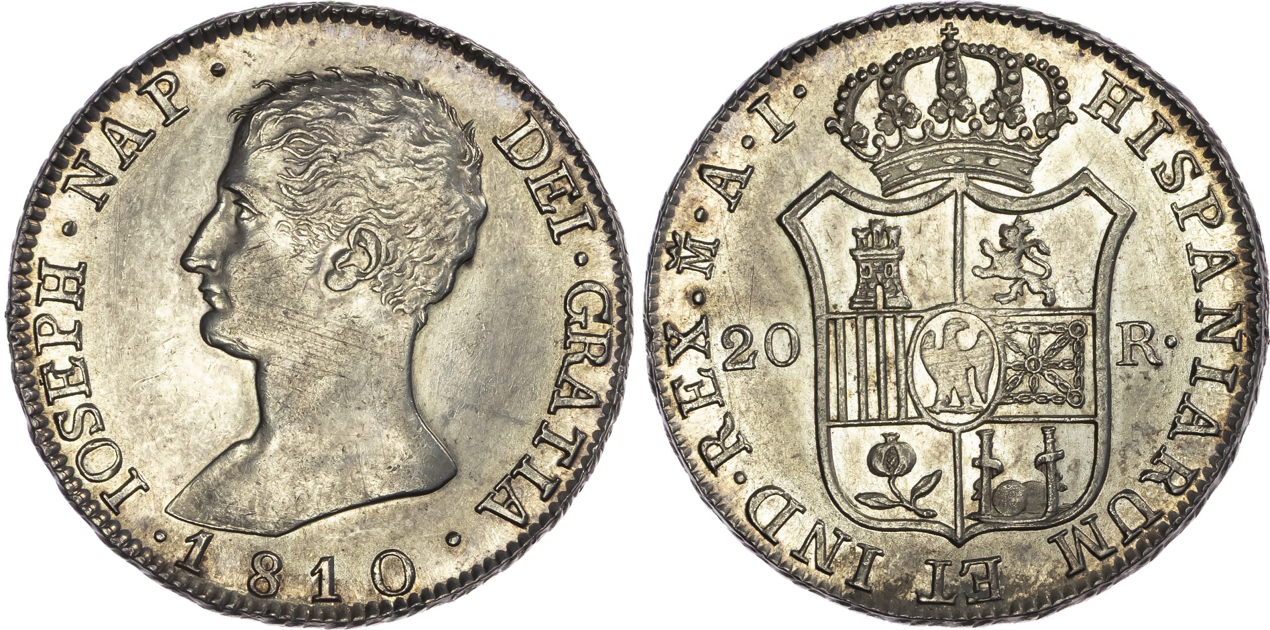 Spain, Joseph Napoleon (1808-1814), silver 20 Reales, 1810 AI, Madrid, 27.18g (KM 551.2; Cal. 25). Good Extremely Fine, minor adjustment marks.