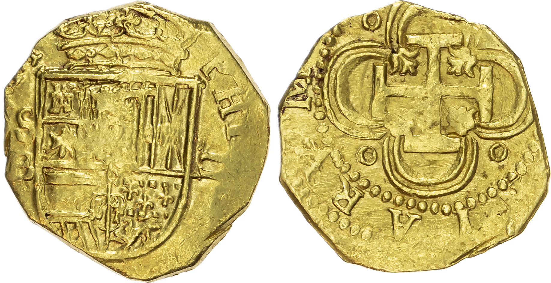 Spain, Philip III (1598-1621) or later, gold 2 Escudos, Seville, mintmark S B, c. 1598-1612, OMNIVM type, 6.79g (A&C 1050). Good Very Fine. Interesting type of uncertain start date that could date to reign of Philip II according to literature.