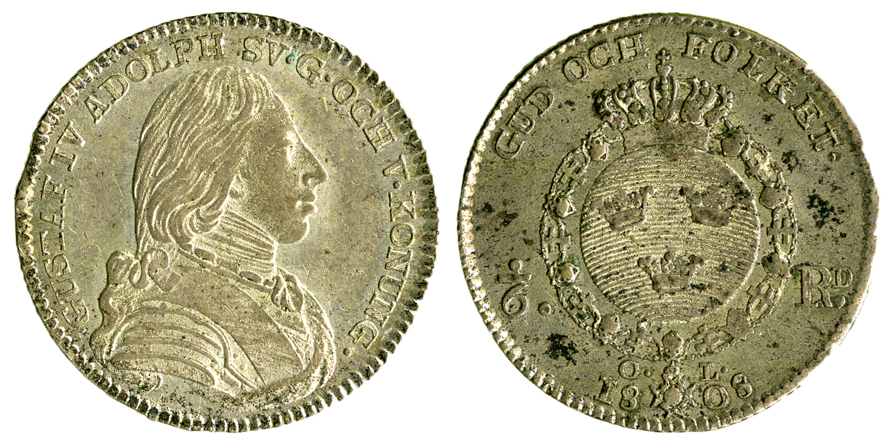 Sweden, Gustav IV Adolph (1792-1809), silver ⅙ Riksdaler, 1808 OL, armoured bust right, rev crowned round shield within order chain, value and date (SM 43; KM 560).
