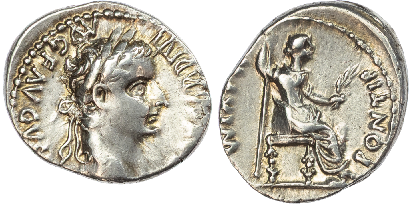 Tiberius (AD 14‑37) Silver Denarius, Lugdunum, c. AD 18‑35, 3.69g. TI CAESAR DIVI F AVGVSTVS, laureate head of Tiberius right. Rev. PONTIF – MAXIM, female figure seated left on throne with ornate legs. (RIC 30; BMC 48; RSC 16a). About Extremely Fine.