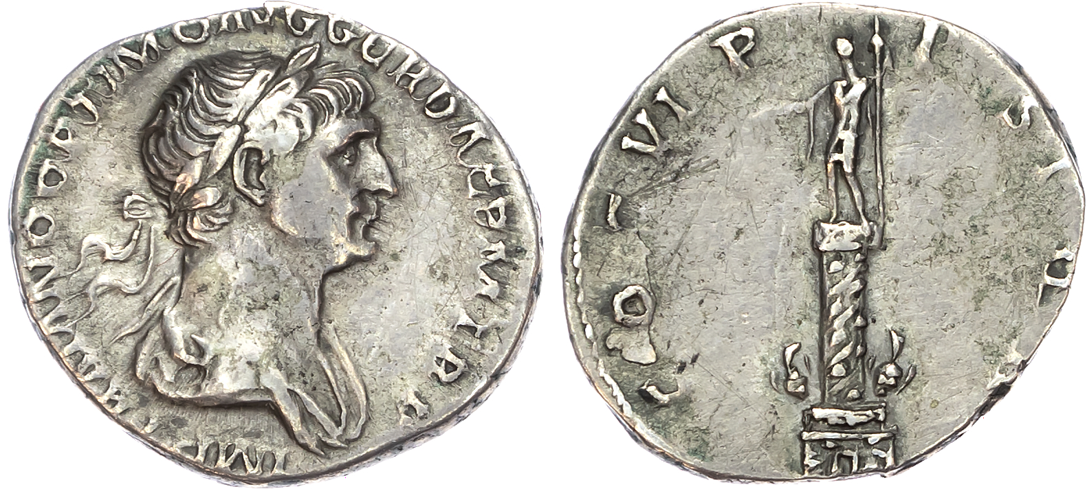 Trajan (AD 98-117) AR Denarius, Rome, AD 114, 3.35g. Obverse: IMP TRAIANO OPTIMO AVG GER DAC PM TR P, laureate and draped bust of Trajan right. Reverse: COS VI P P SPQR, Trajan’s Column. (RIC 292; BMC 452). Good Very Fine.