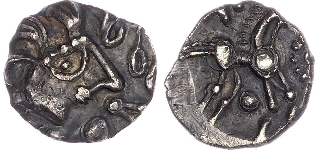 Trinovantes (c. 45-40 BC), AR Unit, ‘Thatcher’s Sister’ type, 1.20g. Female head right, with pointed nose and corded hair, horse and bird to right. Rev. Stylised horse right, bucranium above, pellet-in-annulet below, pelletal sun to right. (ABC 2383; BMC 376). Good Very Fine or better. Rare. Pleasing cabinet tone.
