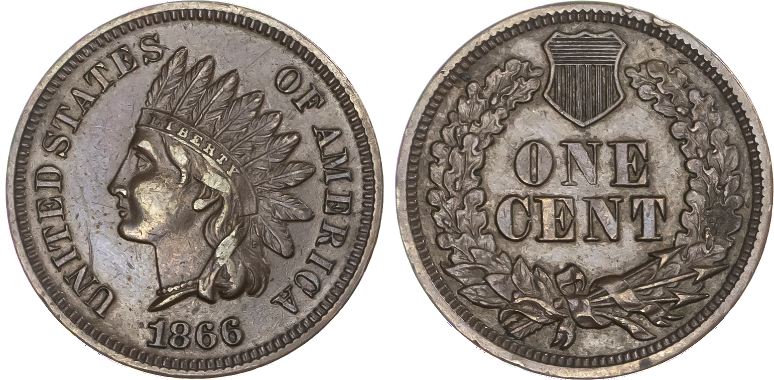 USA, Indian Head bronze Cent, 1866, Philadelphia, 3.00g (KM 90a). Extremely Fine or better.