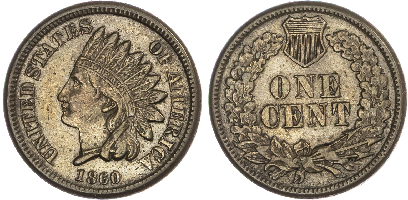 USA, Indian Head copper-nickel Cent, 1860, Philadelphia, oak wreath reverse, with shield, 4.56g (KM 90). About Extremely Fine, bagmarks. First year of the oak leaves reverse.