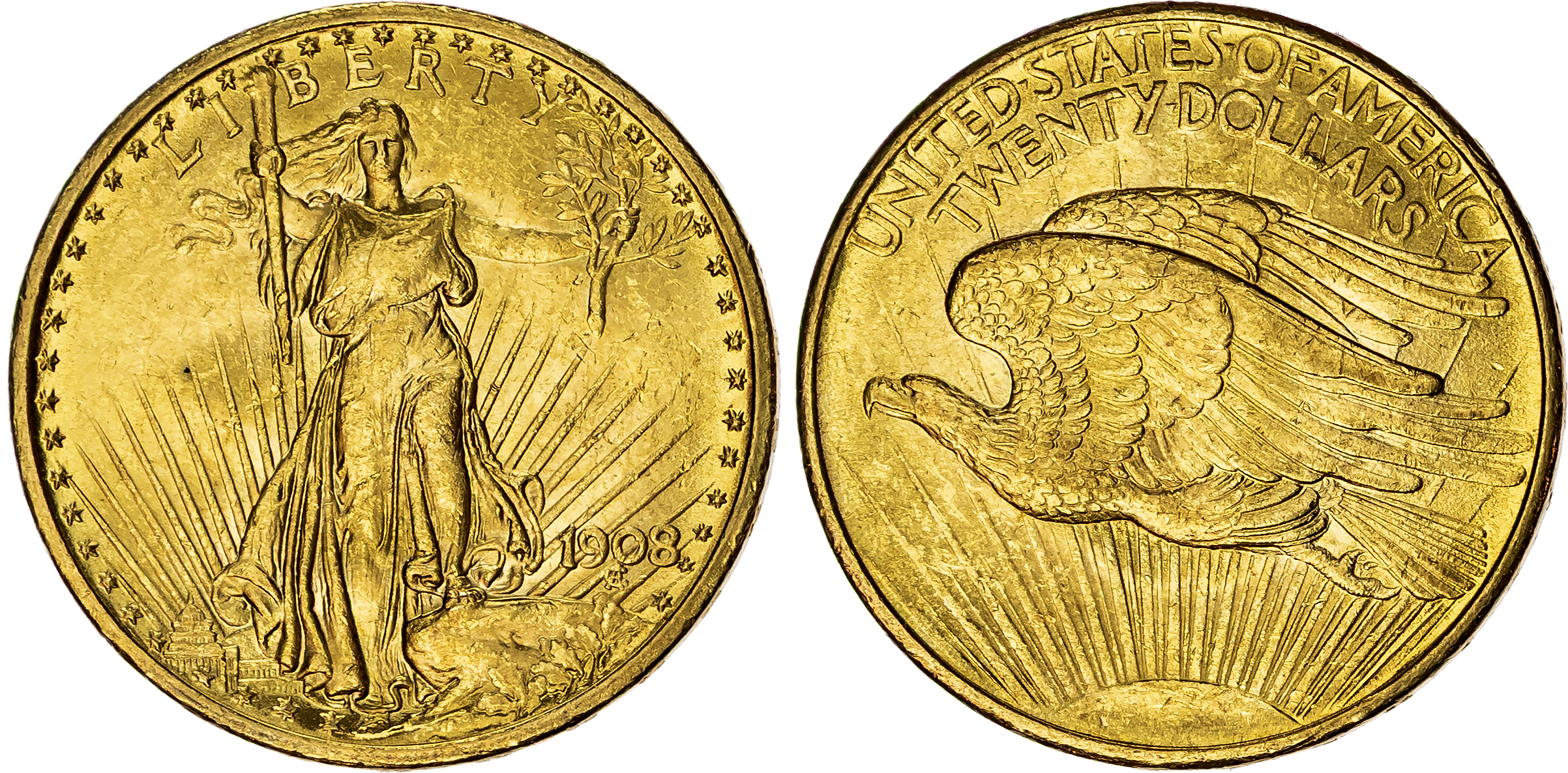 USA, Saint-Gaudens Double Eagle, gold 20 Dollars, 1908, Philadelphia, no motto, 33.48g (Fr. 185). About Uncirculated.