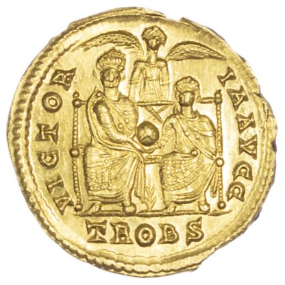 Reverse: VICTOR-IA AVGG, two emperors seated facing, holding globe together between them, Victory with spread wings above, palm branch between.