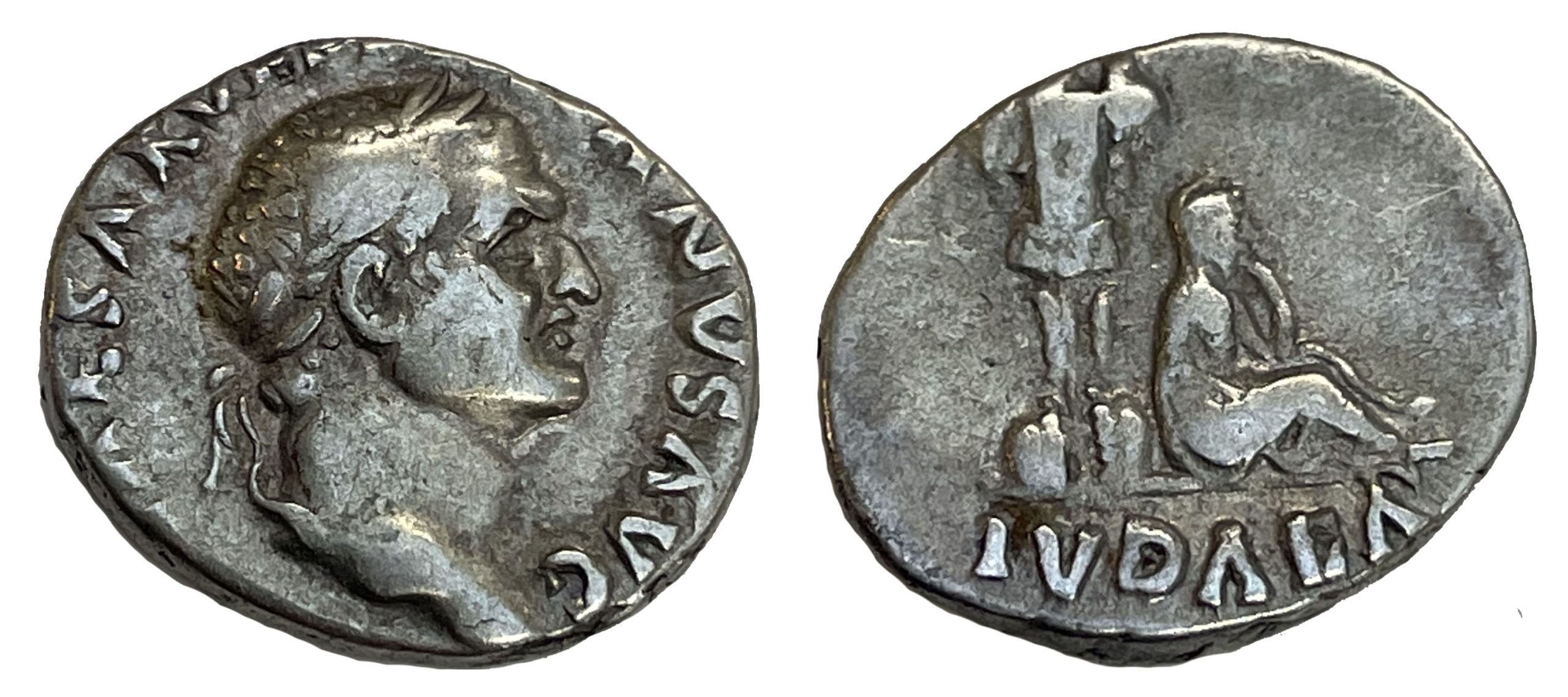 Vespasian (AD 69-79), Silver ‘Judaea Capta’ Denarius, Rome, AD 69-70, 3.41g. Obverse: Laureate head of Vespasian right. Reverse: Judaea, in a state of mourning, seated against trophy of arms. (RIC 2; Hendin 6509). Very Fine.