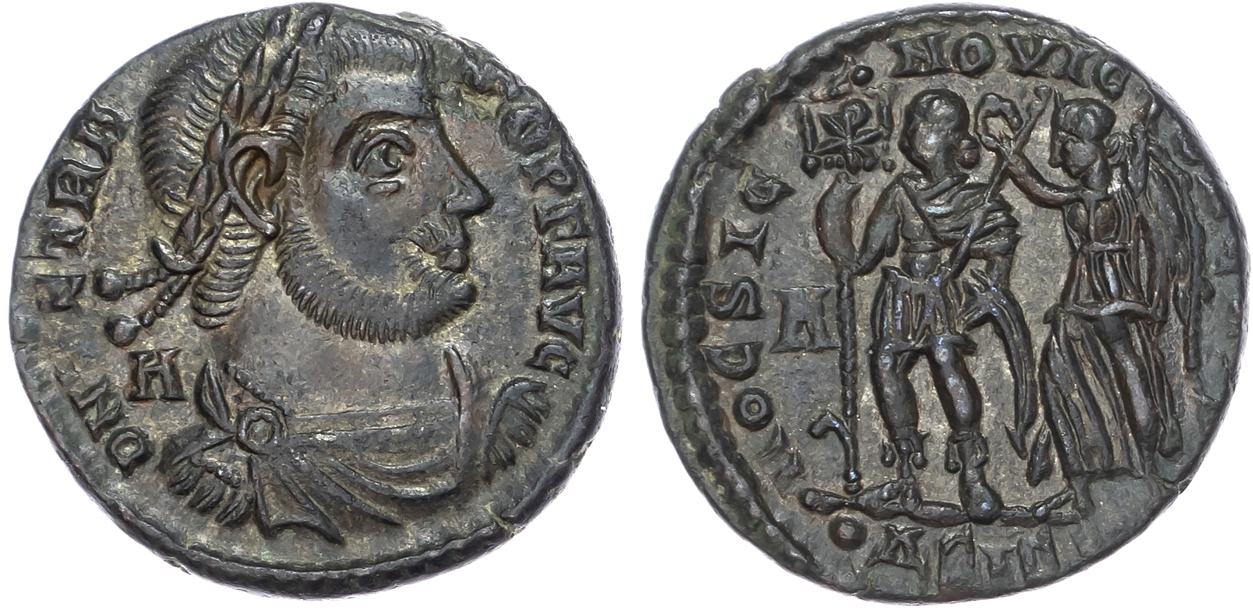 Vetranio (AD 350) Bronze Centenionalis, Siscia, 5.43g. Obverse: D N VETRANIO P F AVG, diademed, draped and cuirassed bust of Vetranio right, H to left. Reverse: HOC SIGNO VICTOR ERIS, Vetranio standing left, holding labarum and spear, being crowned by Victory (right), •ASIS in exergue. (RIC 287). Extremely Fine.