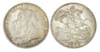 Victoria (1837-1901), Crown, 1893, LVI edge, old head coroneted and veiled left, T.B. below denoting engraver Thomas Brock, legend toothed border both sides, legend surrounds VICTORIA DEI GRA BRITT REGINA FID DEF IND IMP. Rev, Saint George on horseback slaying dragon, date in exergue, B.P. in upper right for Benedetto Pistrucci, edge inscription DECVS ET TVTAMEN ANNO REGNI LVI (S.3937; ESC. 303; Bull. 2593).