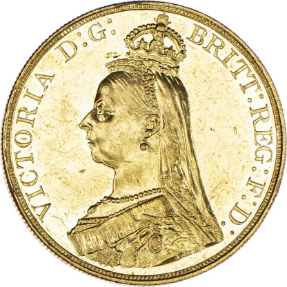 Victoria (1837-1901), Jubilee Five Pounds, 1887, toothed outer borders both sides, crowned bust facing left, J.E.B. on truncation for Joseph Edgar Boehm, legend reads VICTORIA D: G: BRITT: REG: F: D: Rev, Saint George slaying dragon, date in exergue with a small B.P to the right for Pistrucci, edge milled (S.3864; Marsh/Hill.f30; Schneider II. 653).