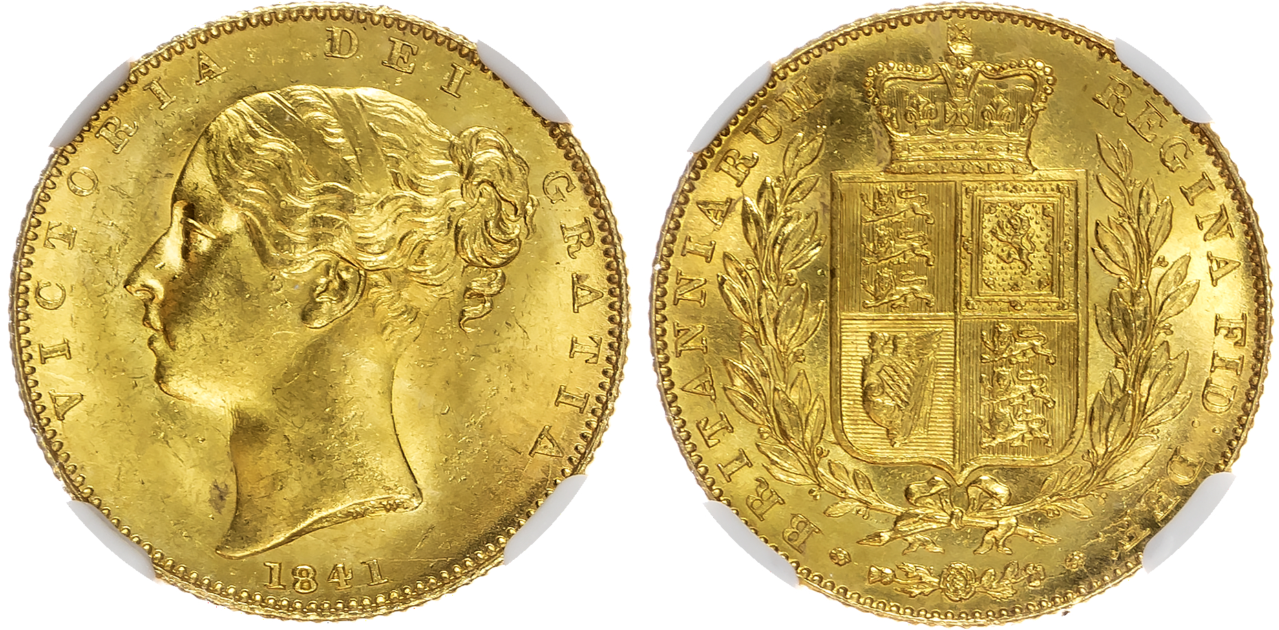 Victoria (1837-1901), Sovereign, 1841, unbarred A’s in GRATIA, first young head left, raised W.W. on truncation, reverse crowned ‘normal’ shield in wreath, edge milled, (Marsh 24A; S.3852). Choice mint state, exceptional. Encapsulated by NGC as MS65.