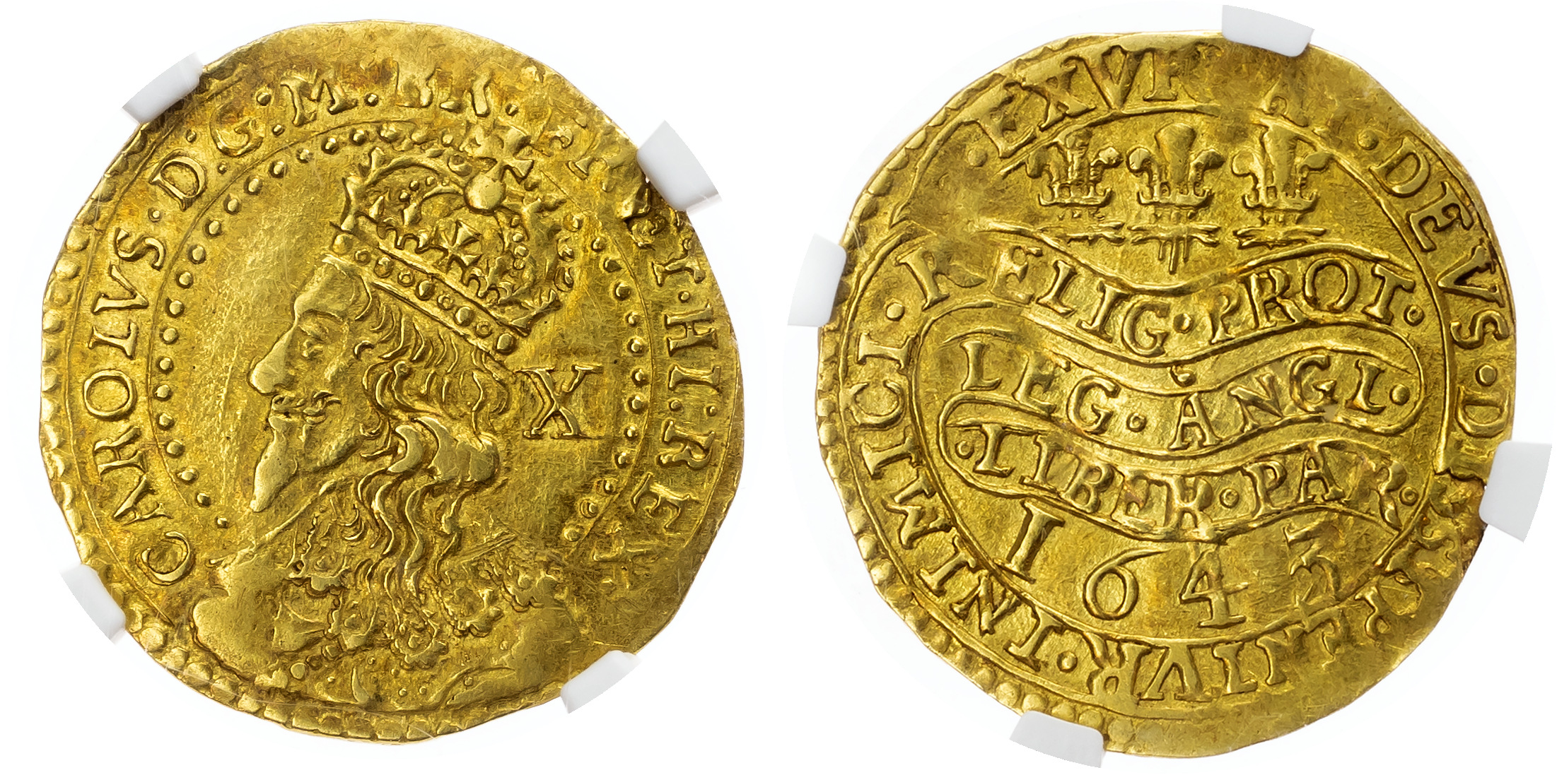 In January 1642 the ‘Long Parliament seized’ power in London and Charles was forced to move north. He reached Nottingham by late August but then turned west to Oxford which he reached in October and set up Court and prepared for war. On the 26th. of October the Civil War commenced with the battle of Edgehill and then followed the famous battles and sieges of Naseby, Newark and Oxford. Peace negotiations in Spring 1646 came to nought the war continued into a second phase when the Scots invaded in 1648. During this time it was the King’s sole right and prerogative to strike coins and to support the ‘Royal Cause’ and supporters’ plate, flatware, jewellery and any precious metal was donated to the king to turn into coin to finance the Royalist war effort. The coins minted in Oxford after the mint was hurriedly set up by Thomas Bushell in January 1643 at the beginning of the war were to procure men, arms, rent, supplies etc. for the war effort – but these large gold coins, the ultimate image of Royal Power, were primarily used to procure allegiance. They were never intended to be saved and most were melted down at the end of the war to be turned into current coin – when the concept of ‘kingship’ changed forever. A few survived, perhaps a little more than two hundred and this rare and magnificent coin, the largest British hammered gold coin is truly emblematic of this troubled age and of the last king of England to rule by divine right.